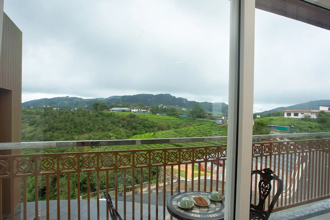 Pearl Tiara rooms that feature king sized beds, a spacious balcony and windows that look down and into a tea plantation draped valley and undulating hills that stretch towards higher peaks on the horizon.